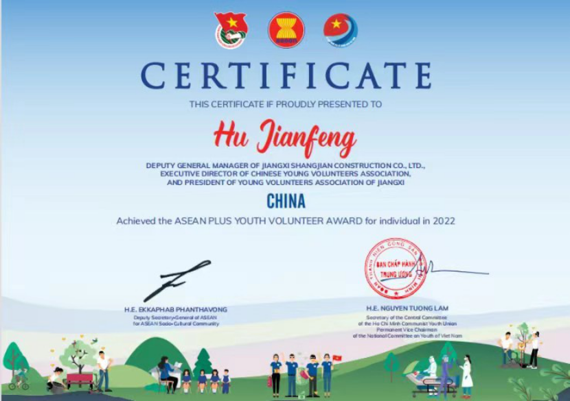 近日,2022年?yáng)|盟國(guó)際合作青年志愿者獎(jiǎng)?lì)C獎(jiǎng)儀式在越南廣平省舉行。該活動(dòng)由越南胡志明共青團(tuán)中央和越南青年國(guó)家委員會(huì)主辦。東盟國(guó)家以及中國(guó)和日本的青年機(jī)構(gòu)、青年組織推薦的10位青年志愿者和11個(gè)青年志愿服務(wù)組織獲獎(jiǎng)。經(jīng)中國(guó)青年志愿者協(xié)會(huì)推薦,中國(guó)青年志愿者協(xié)會(huì)常務(wù)理事、江西省青年志愿者協(xié)會(huì)會(huì)長(zhǎng)、江西上建建設(shè)有限公司副總經(jīng)理胡劍峰獲評(píng)“2022年?yáng)|盟國(guó)際合作青年志愿者獎(jiǎng)”,也是我國(guó)唯一獲此榮譽(yù)的先進(jìn)個(gè)人。
