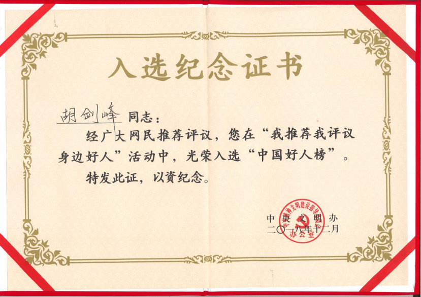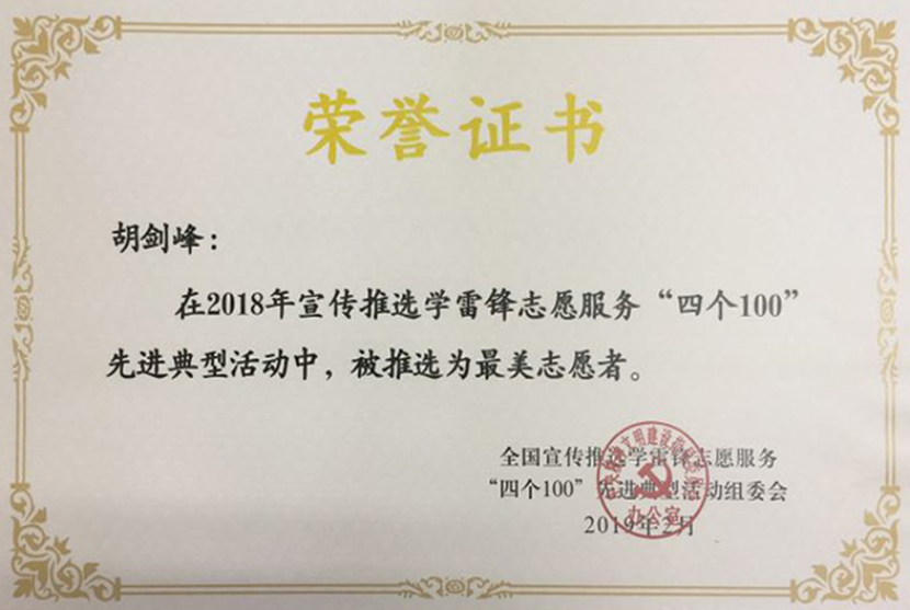 胡劍峰連續(xù)22年參與應(yīng)急救援、生態(tài)環(huán)保、大型賽會(huì)、幫困助殘等志愿服務(wù),志愿服務(wù)時(shí)長(zhǎng)達(dá)11600余小時(shí),組織志愿服務(wù)活動(dòng)近千場(chǎng)次、參與募集公益資金3000余萬元。累計(jì)幫助困難群眾5萬余人次,長(zhǎng)期幫扶孤兒60余人,結(jié)對(duì)資助10人;2008年汶川地震后,他作為江西省第一批災(zāi)后重建志愿者,前往江西對(duì)口援建的小金縣開展災(zāi)后重建服務(wù);2020年新冠肺炎疫情發(fā)生后,他主動(dòng)報(bào)名成為所居住社區(qū)的一名防疫志愿者,連續(xù)43天堅(jiān)守在社區(qū)防疫志愿服務(wù)一線,開展信息登記、掃碼測(cè)溫等服務(wù);累計(jì)參與北京奧運(yùn)會(huì)、廣州亞運(yùn)會(huì)、全國(guó)城市運(yùn)動(dòng)會(huì)、中國(guó)中部投資貿(mào)易博覽會(huì)、世界VR產(chǎn)業(yè)大會(huì)等大型賽會(huì)志愿者招募組織、培訓(xùn)管理等工作數(shù)十次;指導(dǎo)孵化培訓(xùn)志愿服務(wù)組織200余個(gè)、志愿服務(wù)項(xiàng)目500余個(gè)、志愿者骨干3萬余人次。