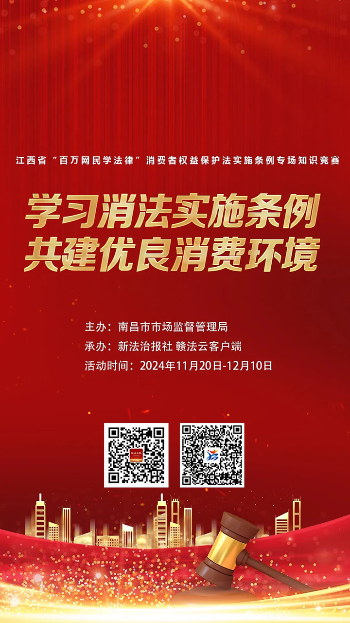 11月20日至12月10日,南昌市市場監(jiān)督管理局聯(lián)合新法治報社、贛法云客戶端,正式啟動江西省“百萬網(wǎng)民學(xué)法律”消費(fèi)者權(quán)益保護(hù)法實施條例專場知識競賽。此活動旨在加深公眾對消費(fèi)者權(quán)益保護(hù)法實施條例的理解,增強(qiáng)消費(fèi)者自我保護(hù)意識,營造更加公平公正的消費(fèi)環(huán)境。