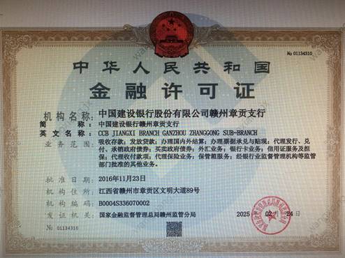 機構名稱:中國建設銀行股份有限公司贛州章貢支行
