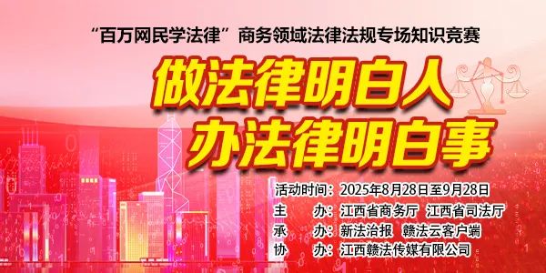 為落實“誰執法 誰普法”責任制,推進商務領域法律法規普法宣傳工作。8月28日起,江西省商務廳、省司法廳聯合主辦“百萬網民學法律”商務領域法律法規專場知識競賽活動,本次活動為期一個月,由新法治報、贛法云客戶端承辦,江西贛法傳媒有限公司協辦。