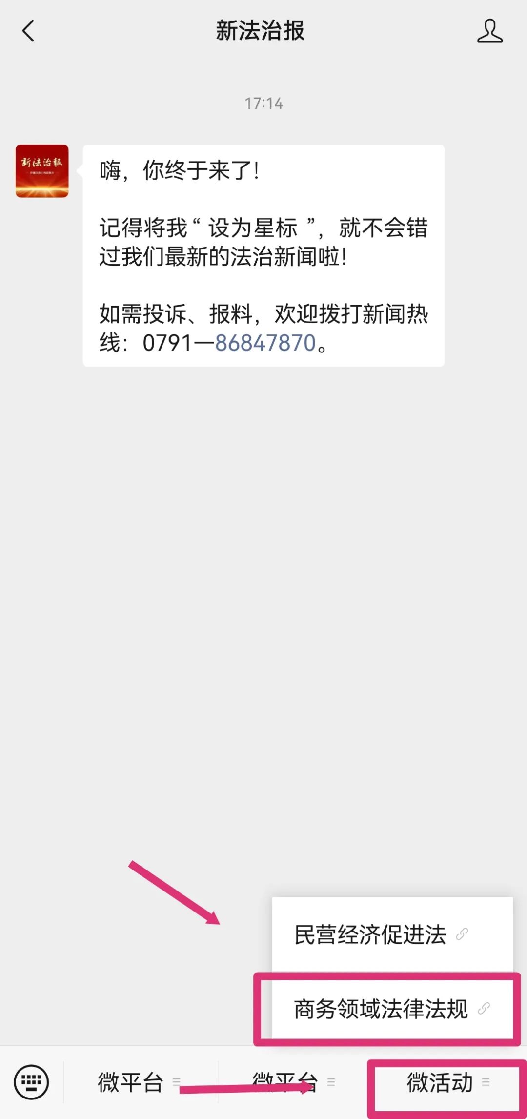 渠道一:關注“新法治報”微信公眾號或關注“百萬網民學法律”微信公眾號,點擊“微活動”欄目,進入“商務領域法律法規”,以“新法治報”微信公眾號為例↓↓↓