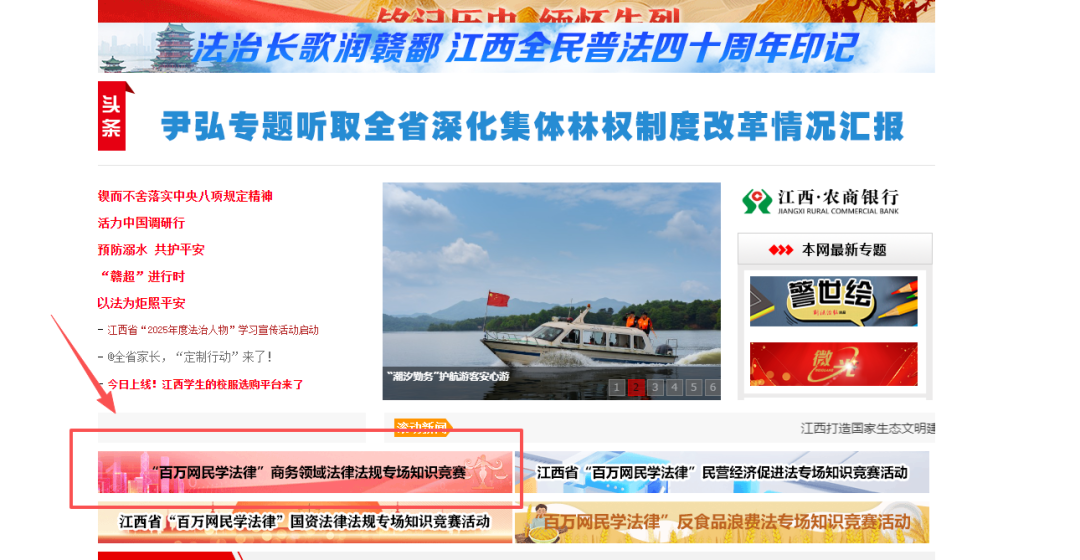 渠道二:登錄江西法制網,點擊“‘百萬網民學法律’商務領域法律法規專場知識競賽活動”登錄專題頁面,點擊“參賽通道”在線答題。