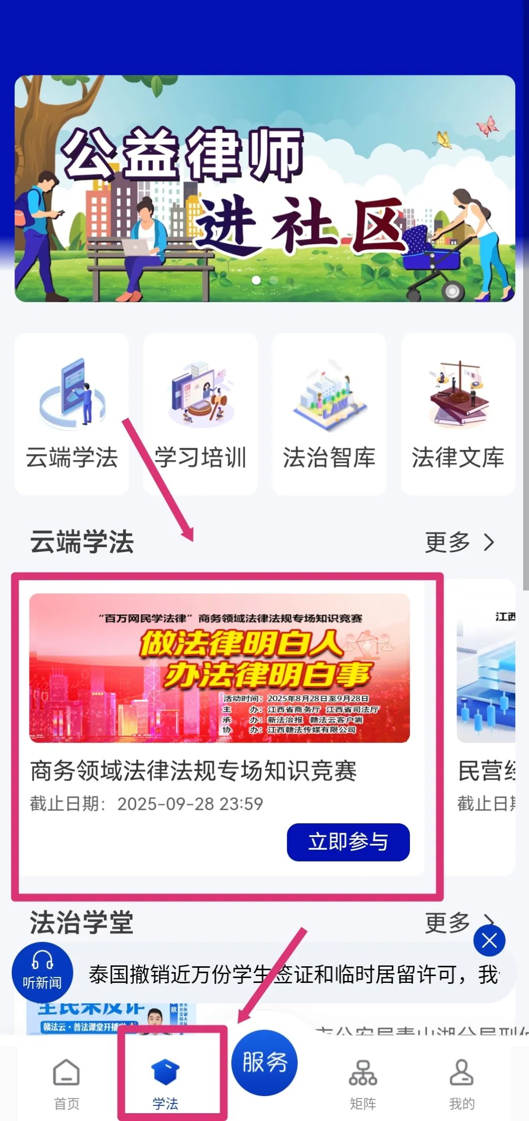 渠道三:進入贛法云客戶端首頁,點擊“學法”欄目,找到“商務領域法律法規專場知識競賽活動”活動頁面,即可在線答題。