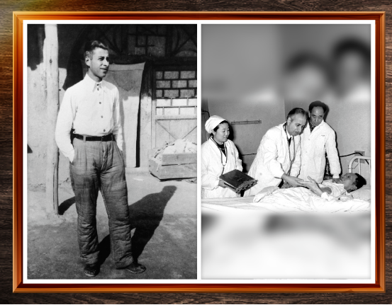 左圖是1943年,米勒在延安國際和平醫(yī)院任內(nèi)科主任的資料照片;右圖是1981年,米勒教授(中)和醫(yī)生一起查病房。