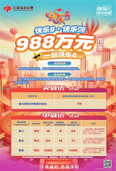 福彩快樂8,向快樂出發(fā)!9月12日起,江西省福利彩票發(fā)行中心(以下簡稱江西福彩)在全省開展“快樂8·快樂購”988萬元贈票活動,對快樂8游戲“選九玩法12碼復式”投注彩票“買就送”,對快樂8游戲單票金額20元及以上的“選二”“選三”“選五”玩法的中獎彩票“中就送”。