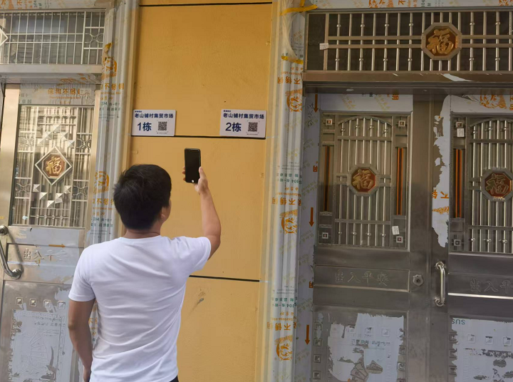 網格員正掃描老山鋪安置小區樓棟上的二維碼(圖/記者連永成)