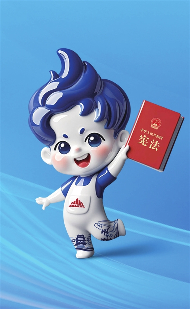 “贛法寶”是從一只青花瓷里走出的普法小精靈,也是江西的普法代言人。“贛法寶”身上細(xì)節(jié)滿滿:隨身攜帶憲法書本,凸顯憲法核心地位;發(fā)型靈感源自省鳥白鶴的翅膀,象征生態(tài)江西法治守護(hù);背帶褲童真款式拉近法律與大眾距離,胸部紅色井岡山輪廓線條寓意不忘紅色初心,褲腳上滕王閣、廬山、婺源花海的青花紋樣,寓意著法治種子播撒在贛鄱大地的每一個(gè)角落。它還有“魔法口袋”,能掏出法律手冊(cè)、普法文創(chuàng),提供法律服務(wù)。